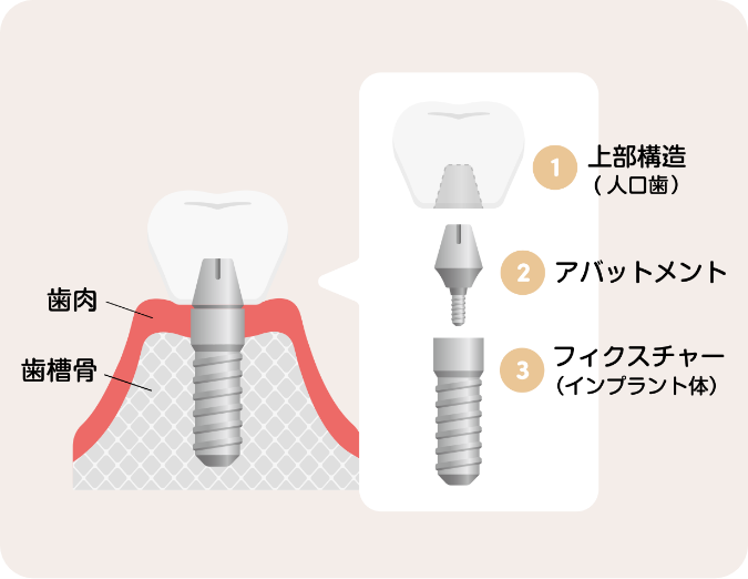 インプラントとは、失ってしまった自分の歯の代わりに、人工の歯根を顎の骨に埋め込み、その上に人工の歯を装着して噛み合わせを回復する治療法です。